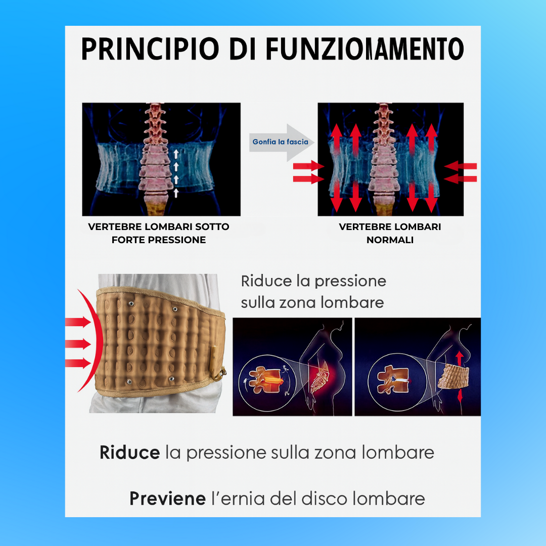 La cintura utilizza un sistema di gonfiaggio regolabile che crea una leggera trazione sulla zona lombare. Questo aiuta a ridurre la pressione sulla colonna, favorendo un’immediata sensazione di sollievo e migliorando la postura.